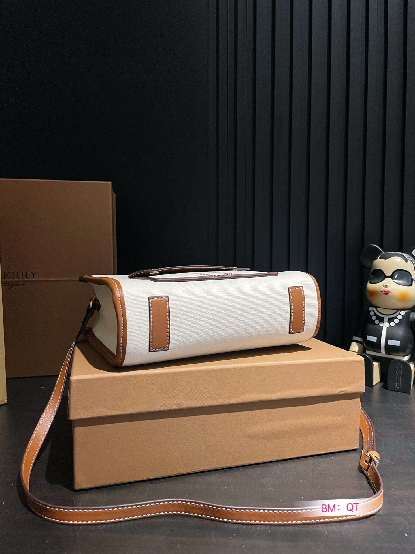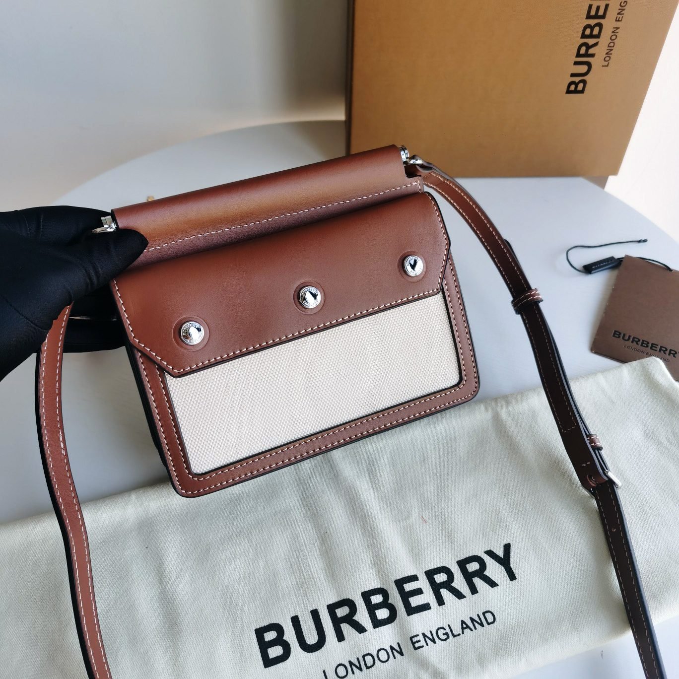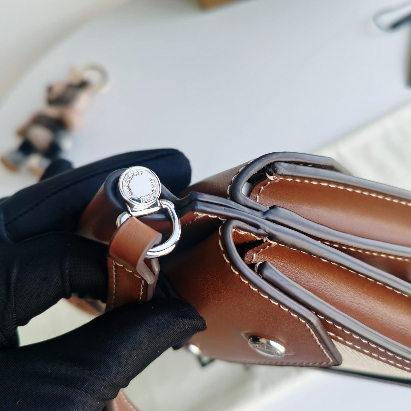 The Burberry small diagonal backpack “title Telte handbag” is made of leather and canvas decorated with Li embroidery thread. It features a fashion show style horseferry print, exquisite top metal rod design, and three rivets for opening and closing.