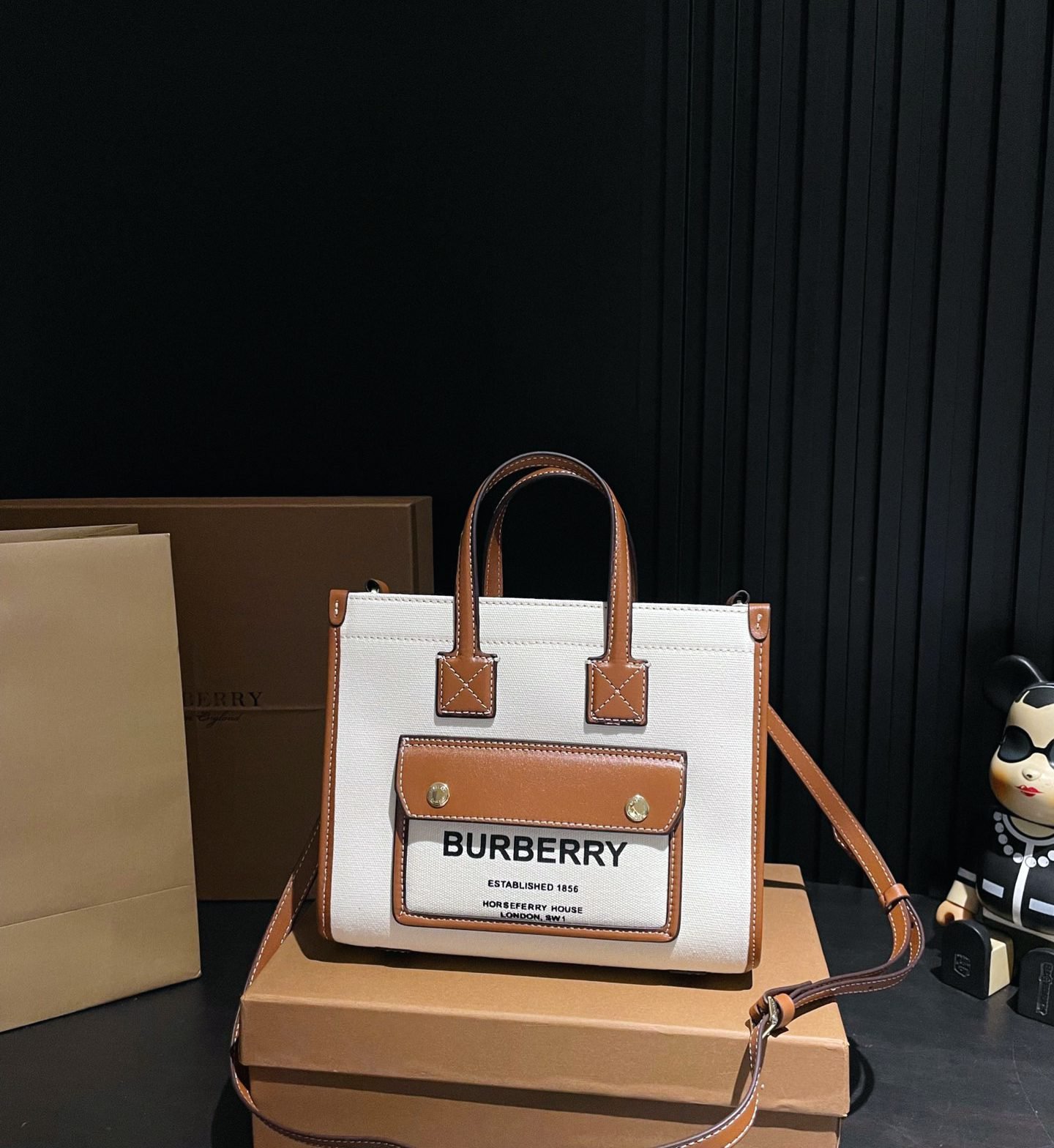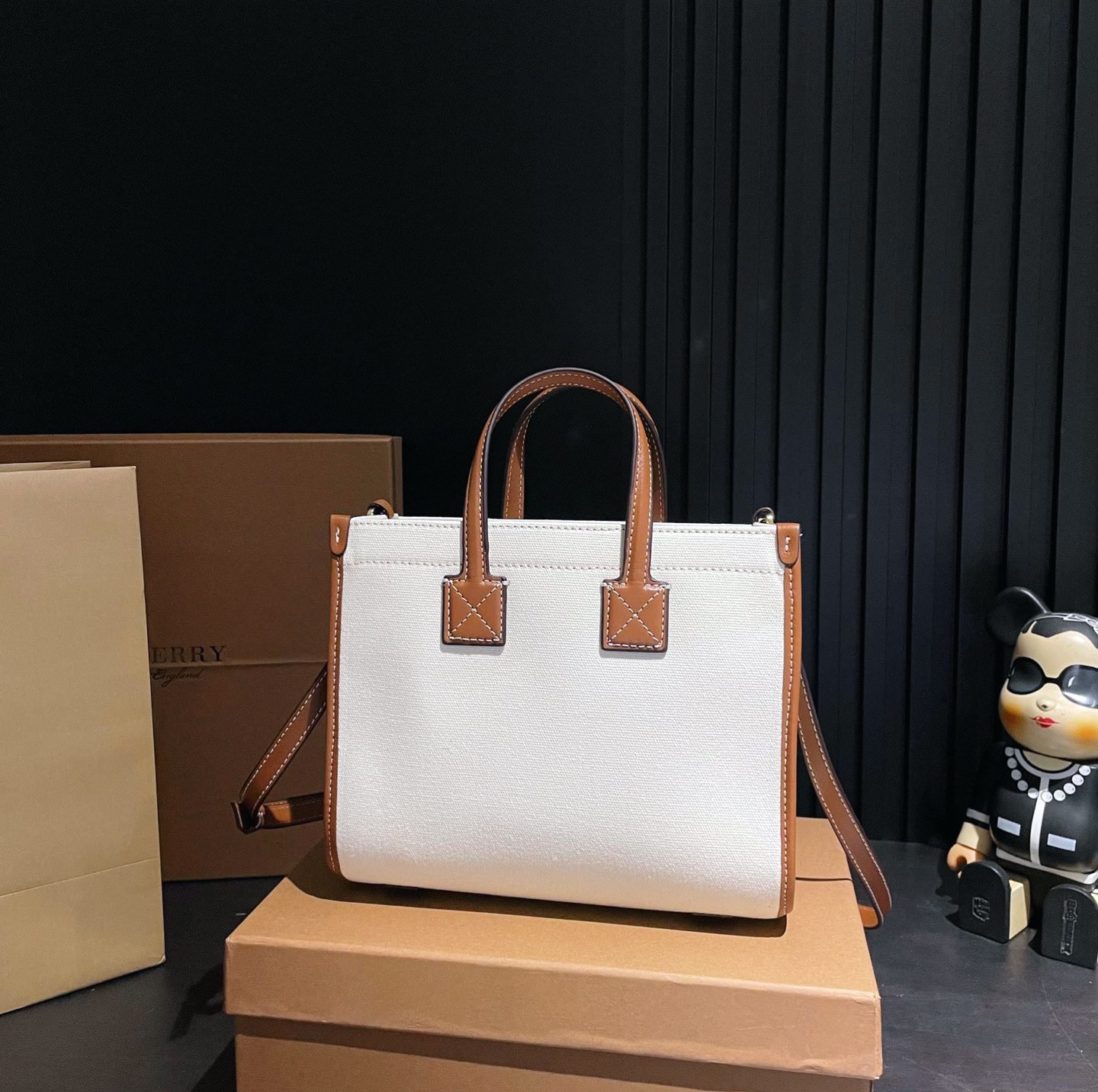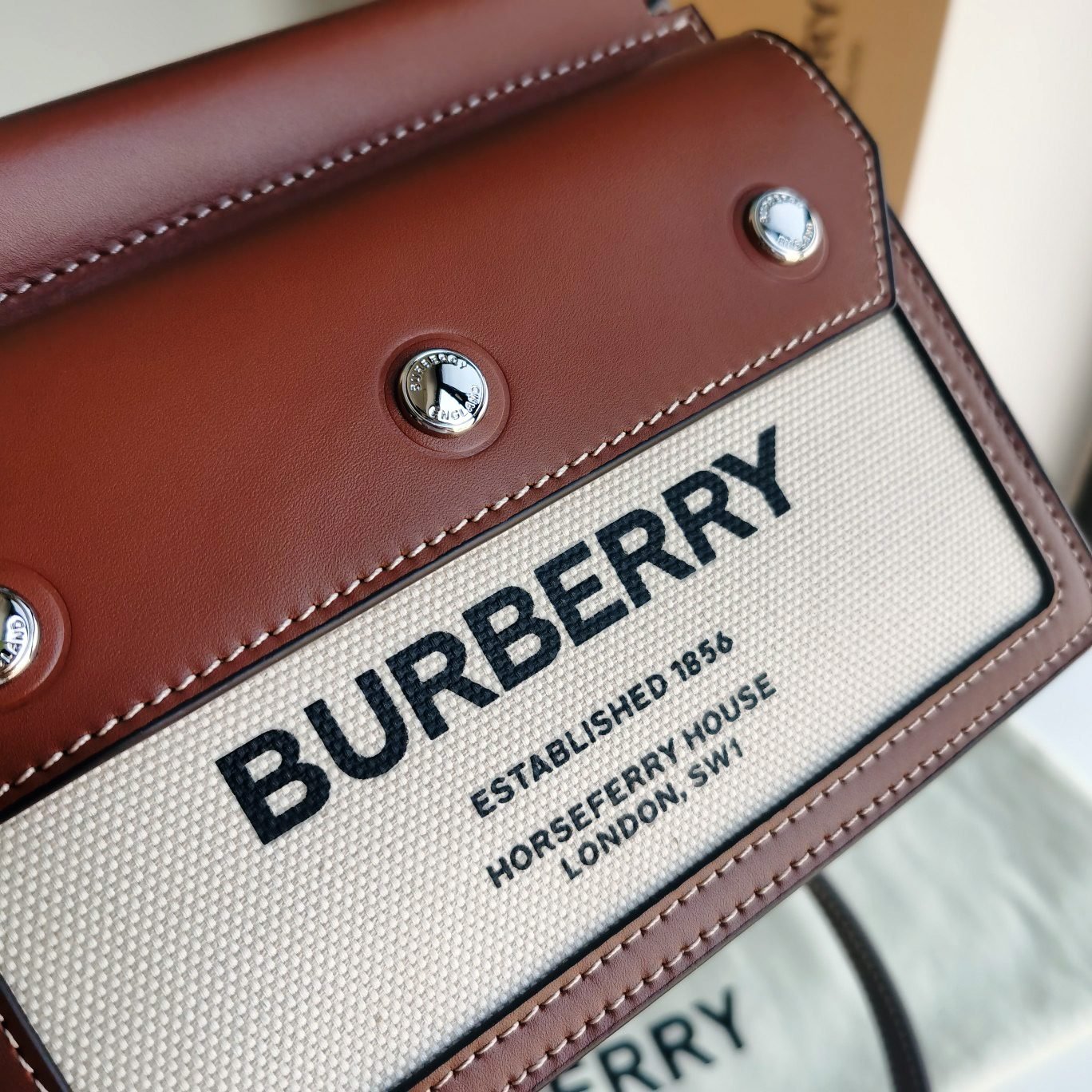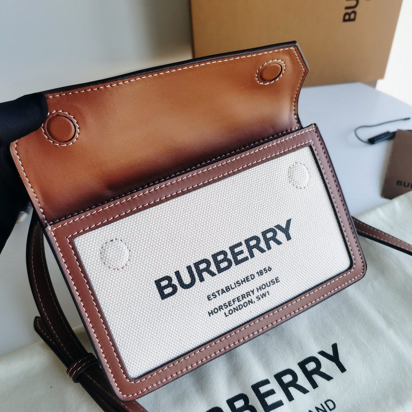 The Burberry small diagonal backpack “title Telte handbag” is made of leather and canvas decorated with Li embroidery thread. It features a fashion show style horseferry print, exquisite top metal rod design, and three rivets for opening and closing.