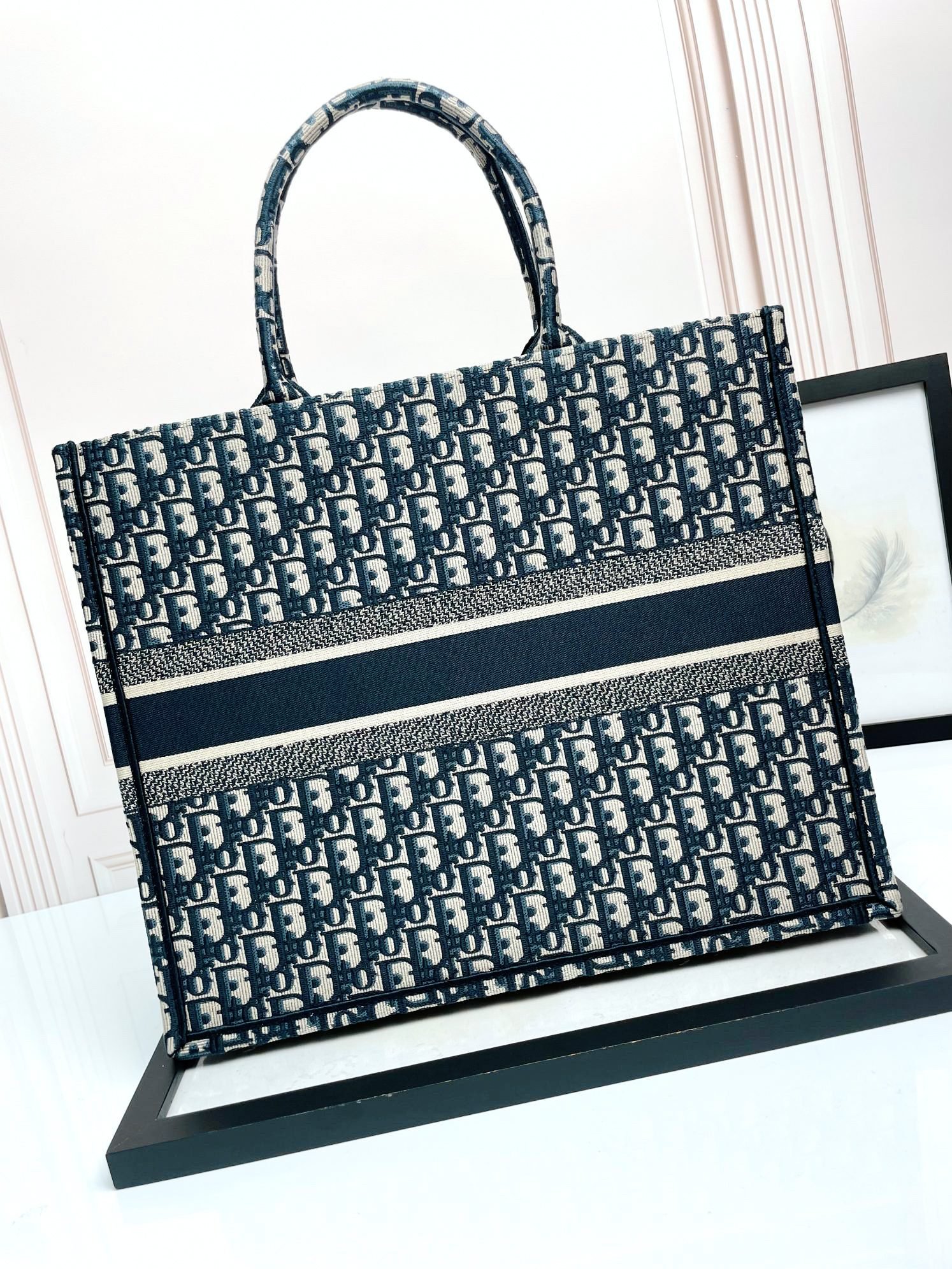 Maria Grazia Chiuri’s hallmark Dior Book Tote is offered in an elegant variation. The refined style showcases an iconic blue Dior Oblique embroidery and calfskin. Designed to keep all the daily essentials organized, the interior is equipped with a zip pocket and slip pockets. Featuring an embroidered adjustable, removable strap, the practical medium tote exemplifies Dior’s savoir-faire and can be carried by hand or worn over the shoulder.