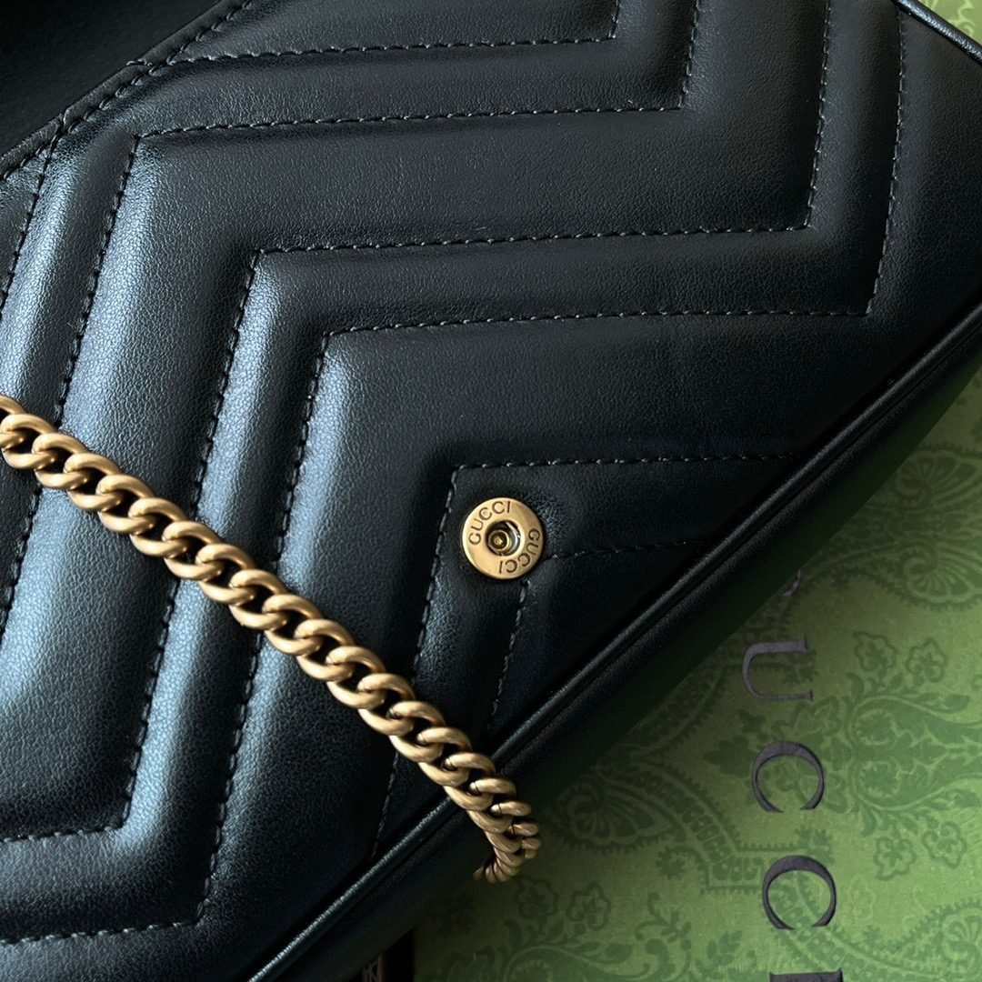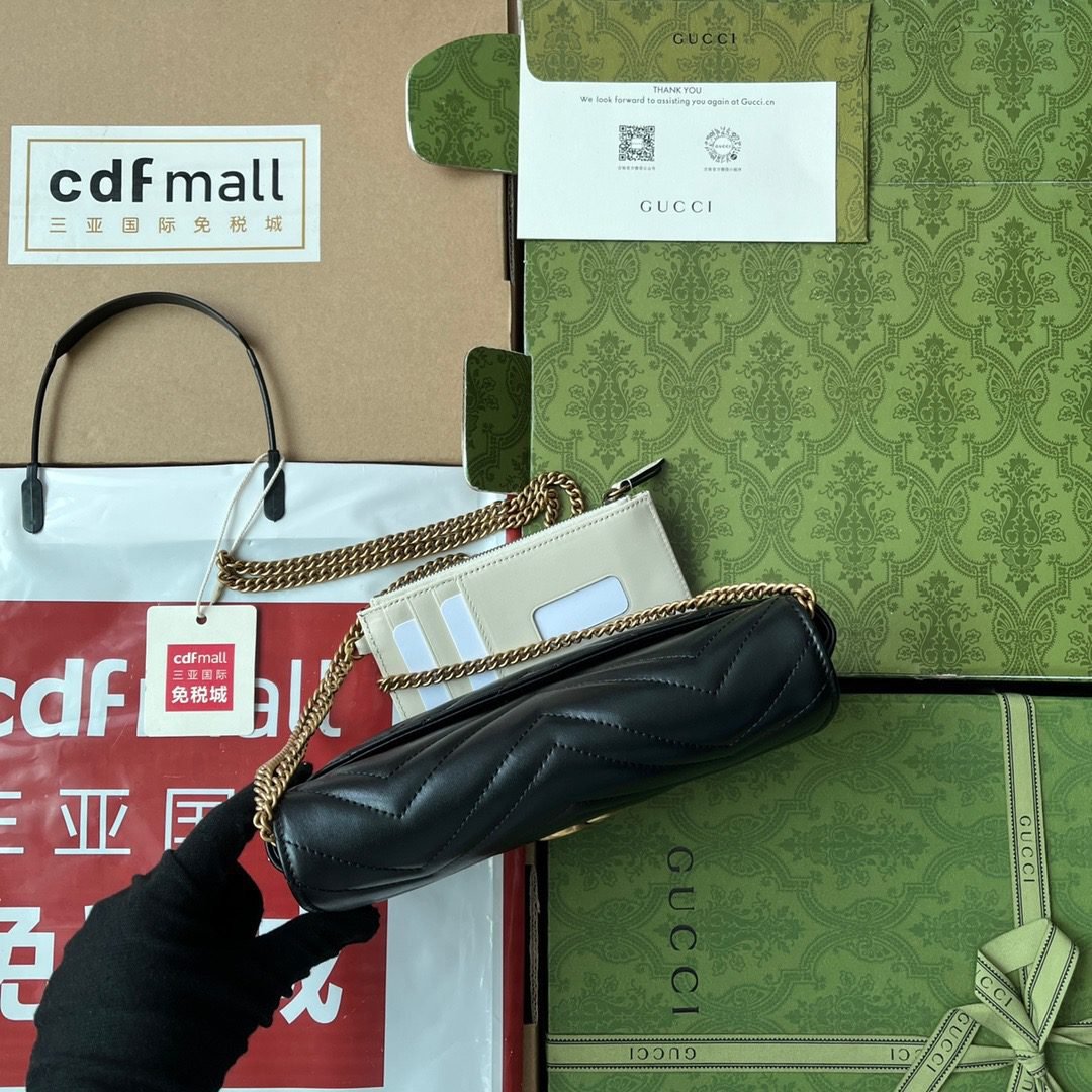 The Double G hardware brings the past into the House’s present with the notion that a cherished wardrobe is enriched by items that can be worn season after season. This bag with a chain strap is crafted from the signature matelassé chevron leather in black, while the inside features a contrasting white leather card case that can be detached