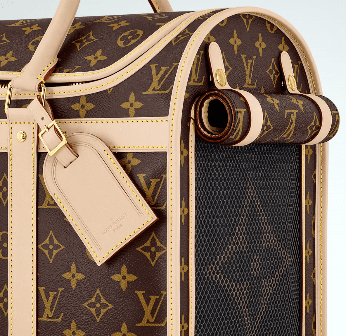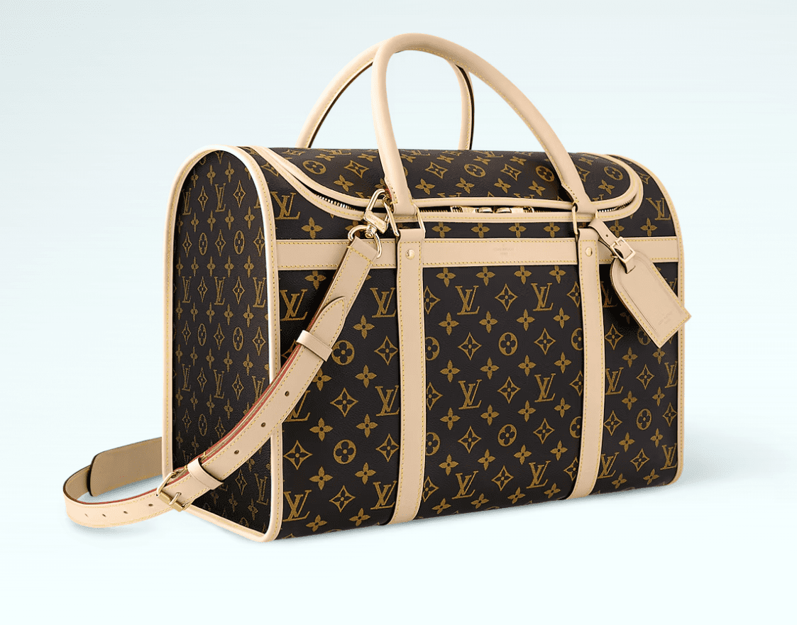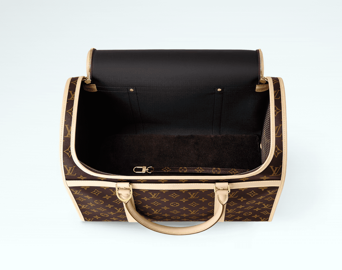 Louis Vuitton’s classic Dog Carrier has been updated with a sleek design and handy new functions. Styled in Monogram canvas with natural cowhide trim like the historic version, it’s designed for comfort with plush carpet and a soft ventilation net. Easy to carry with its adjustable shoulder strap, it’s the stylish, practical way to travel with a pet.