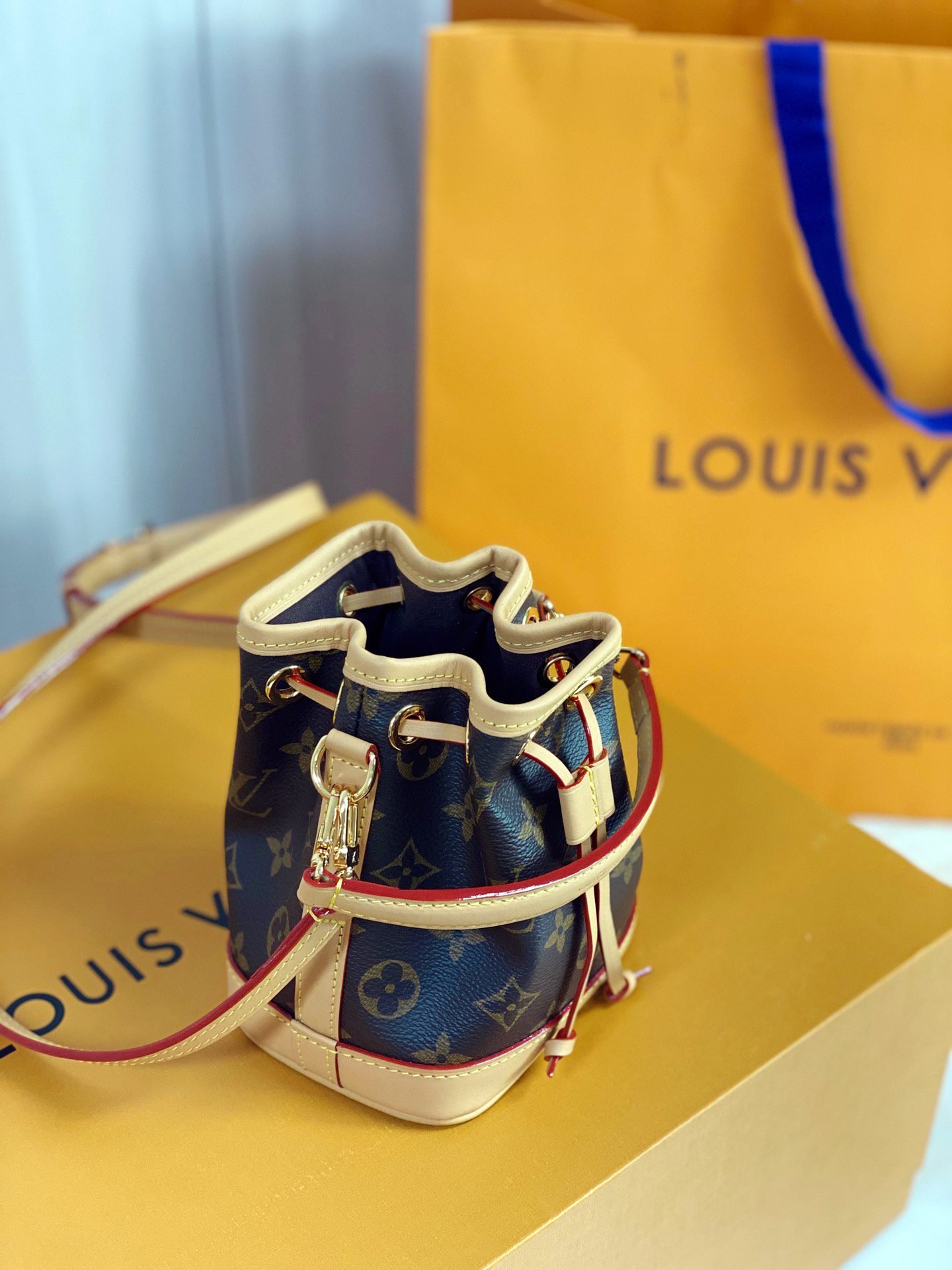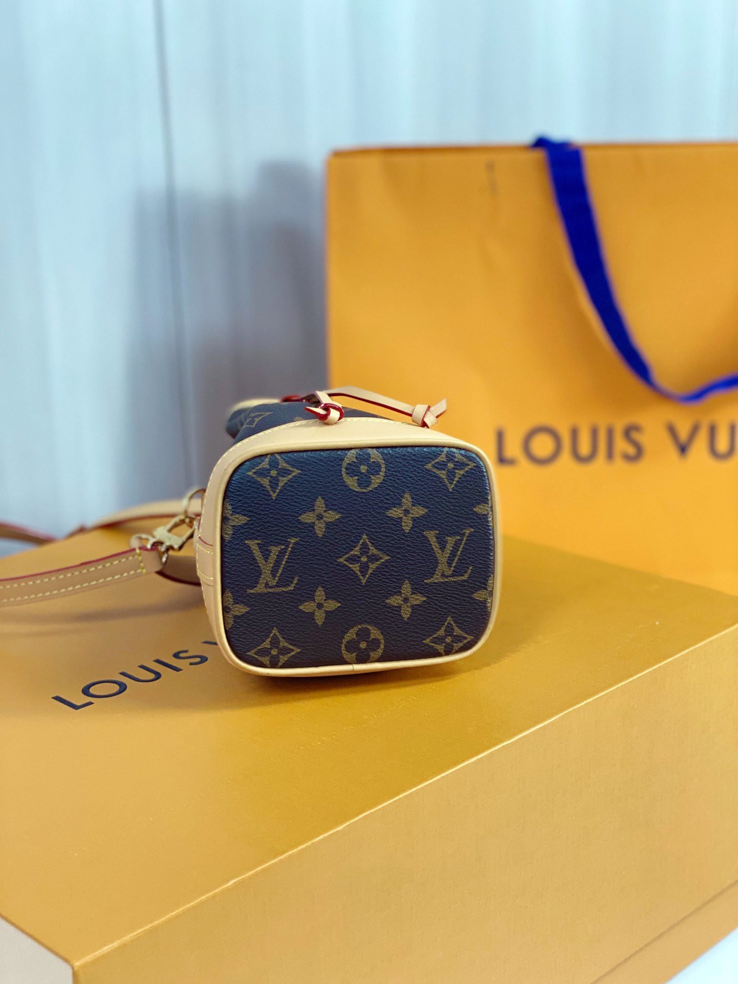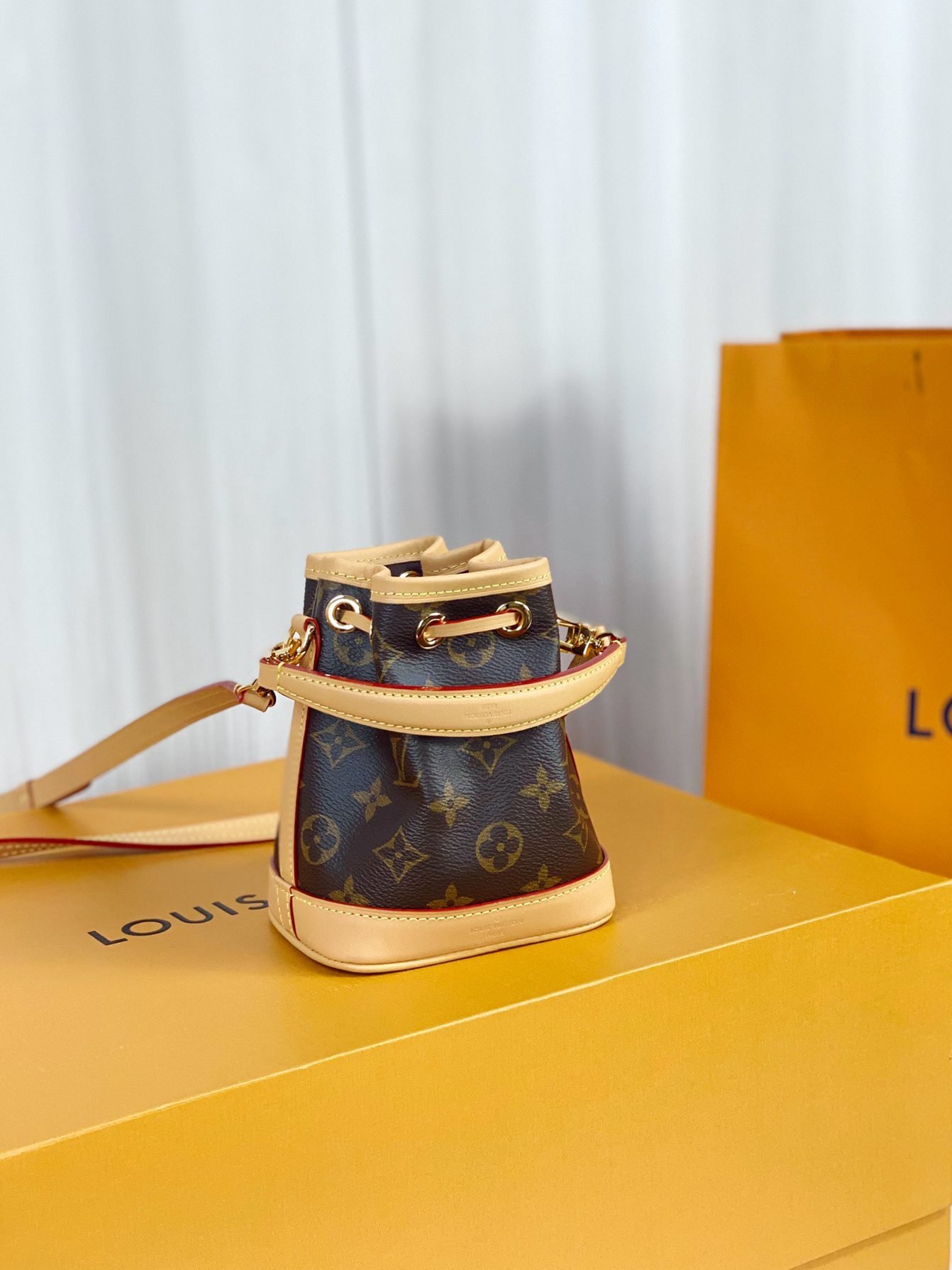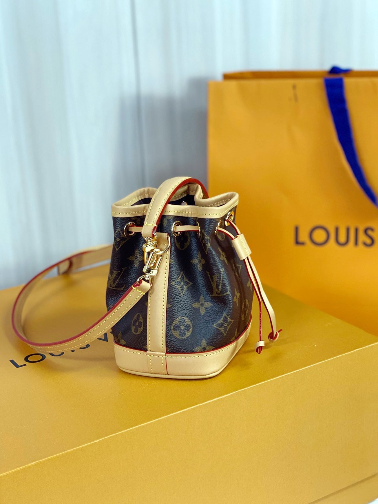 The Nano Noé is a miniature version of the iconic Noé bag, created in 1932. Crafted from Monogram canvas with trim in natural cowhide leather, this tiny Nano Noé combines heritage with modern functionality. Its removable handle and removable, adjustable strap offer multiple carry options, while it is spacious enough to hold essentials including keys, a card holder and a smartphone.