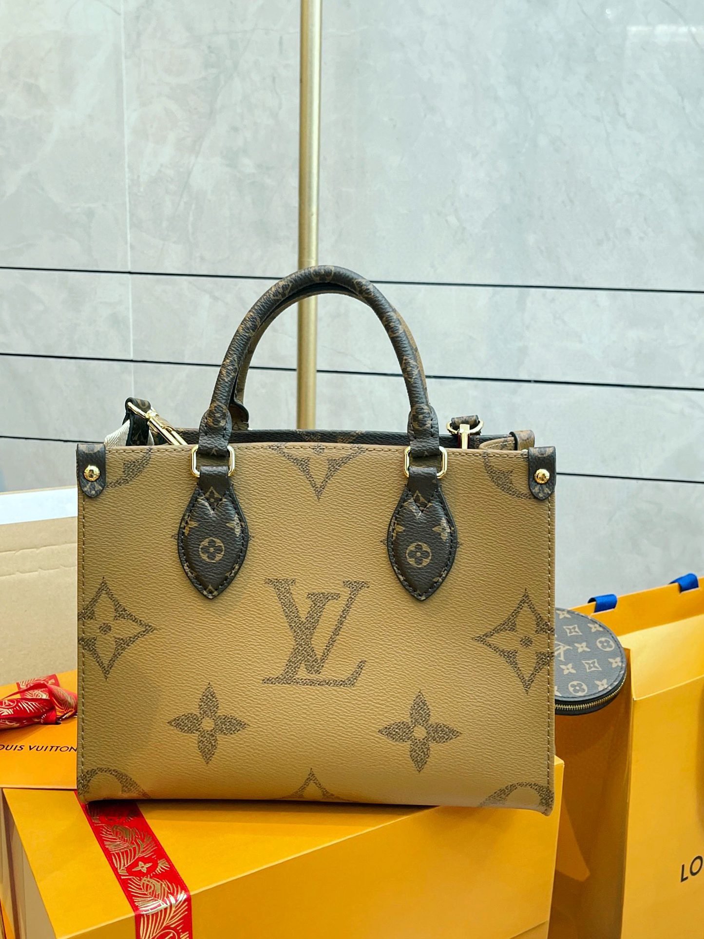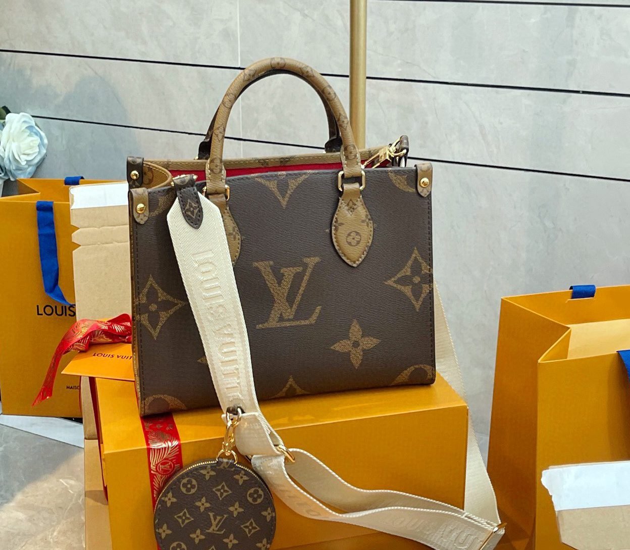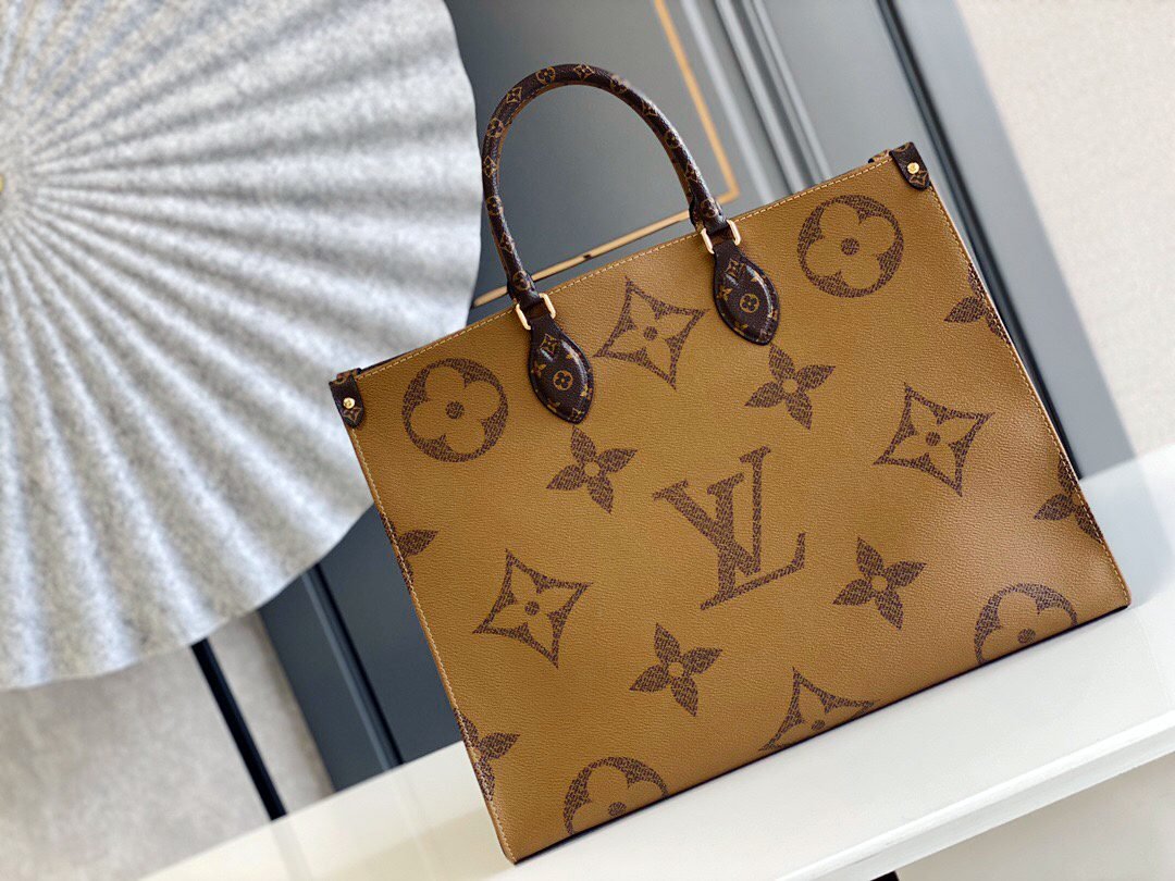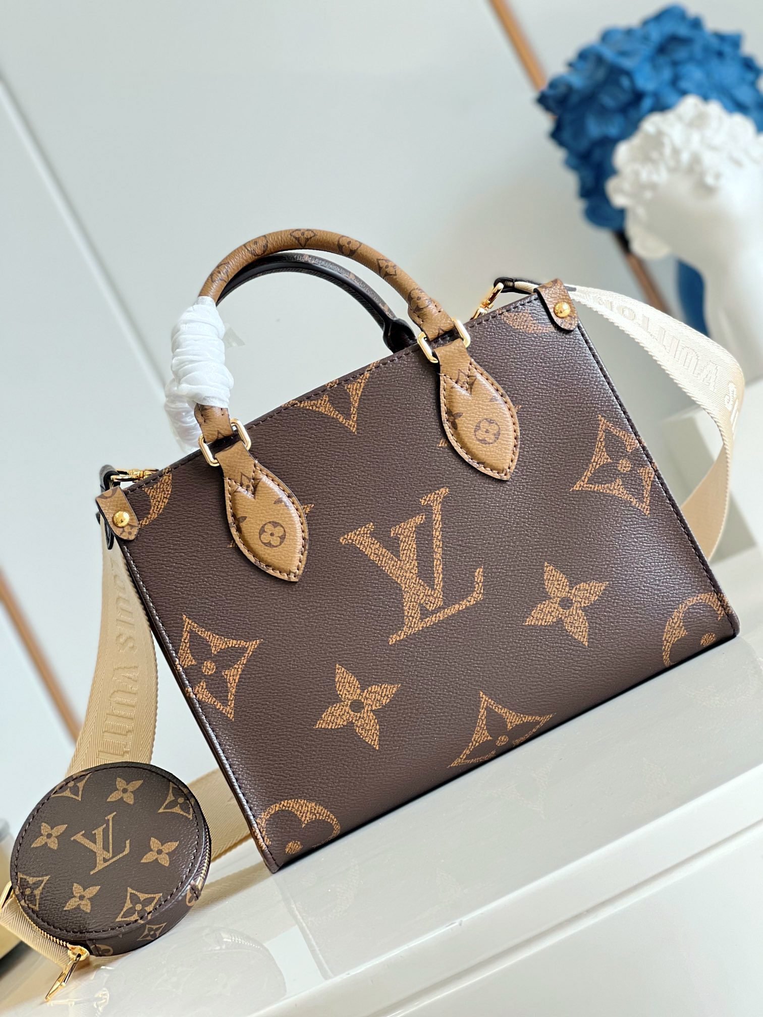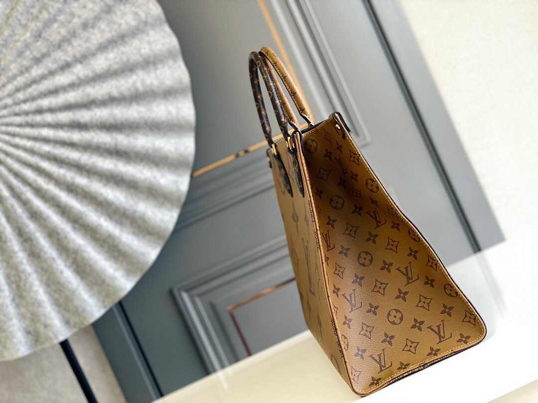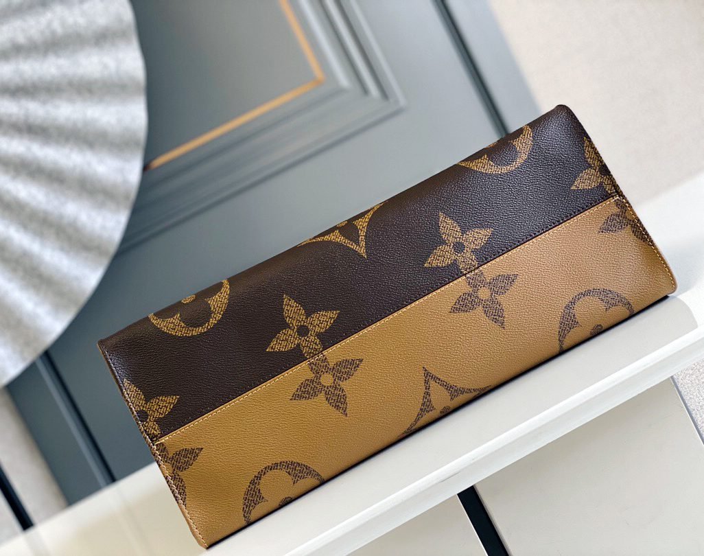 The name says it all: OnTheGo MM takes care of business or shopping, with plenty of room for a busy woman’s essentials. With Giant Monogram canvas on one side and Monogram Reverse on the other, it is virtually two bags in one. Twin Toron top handles and two shoulder straps offer several different carry styles, for extra versatility.