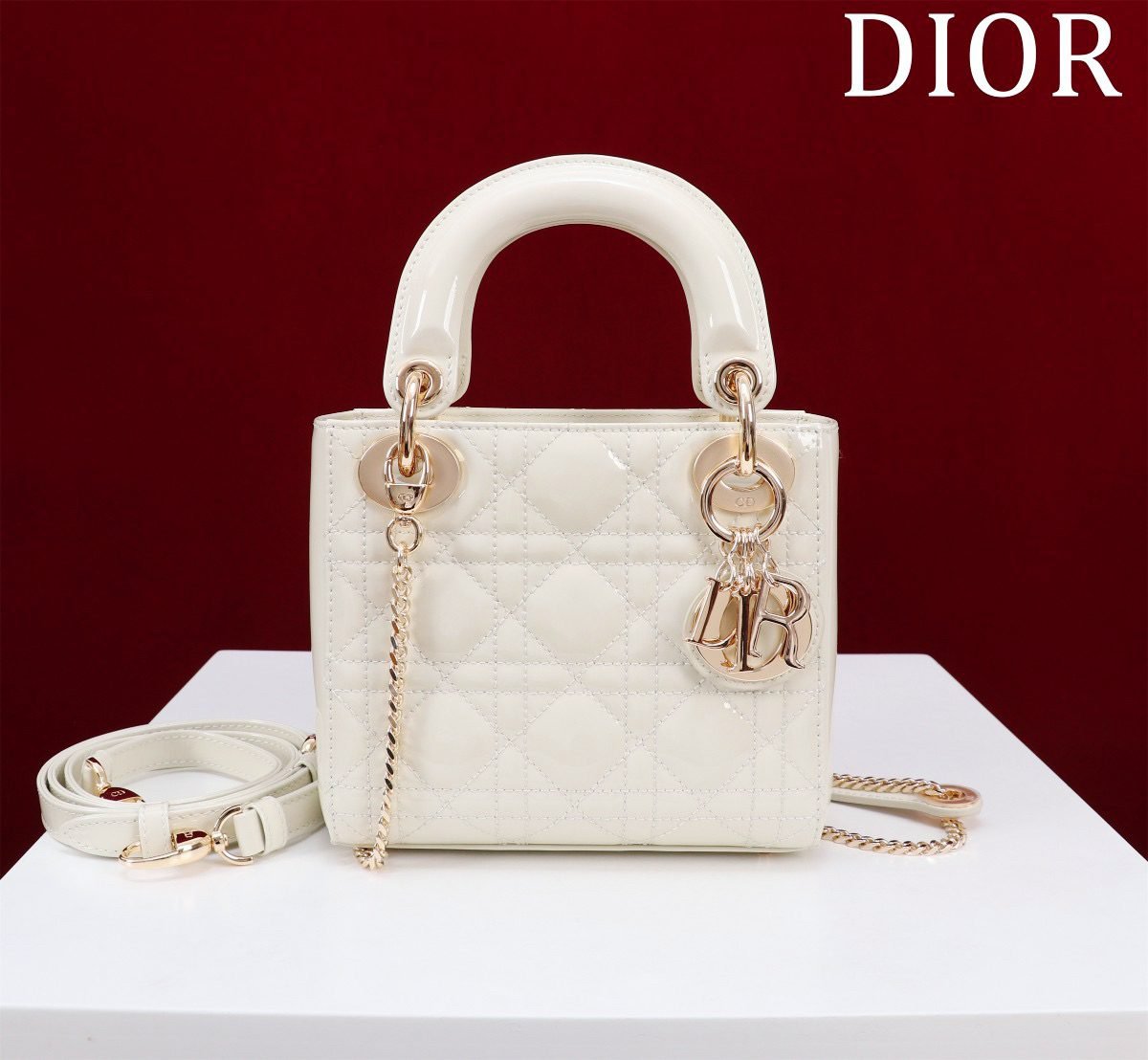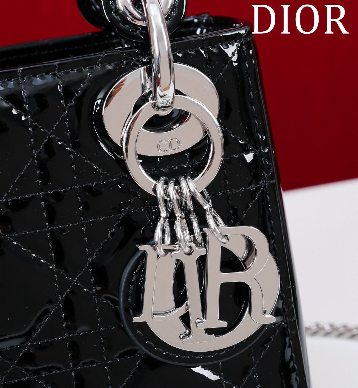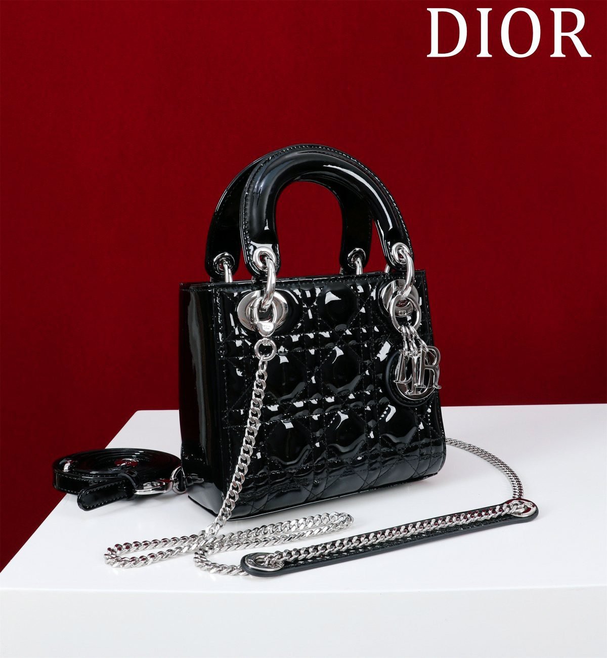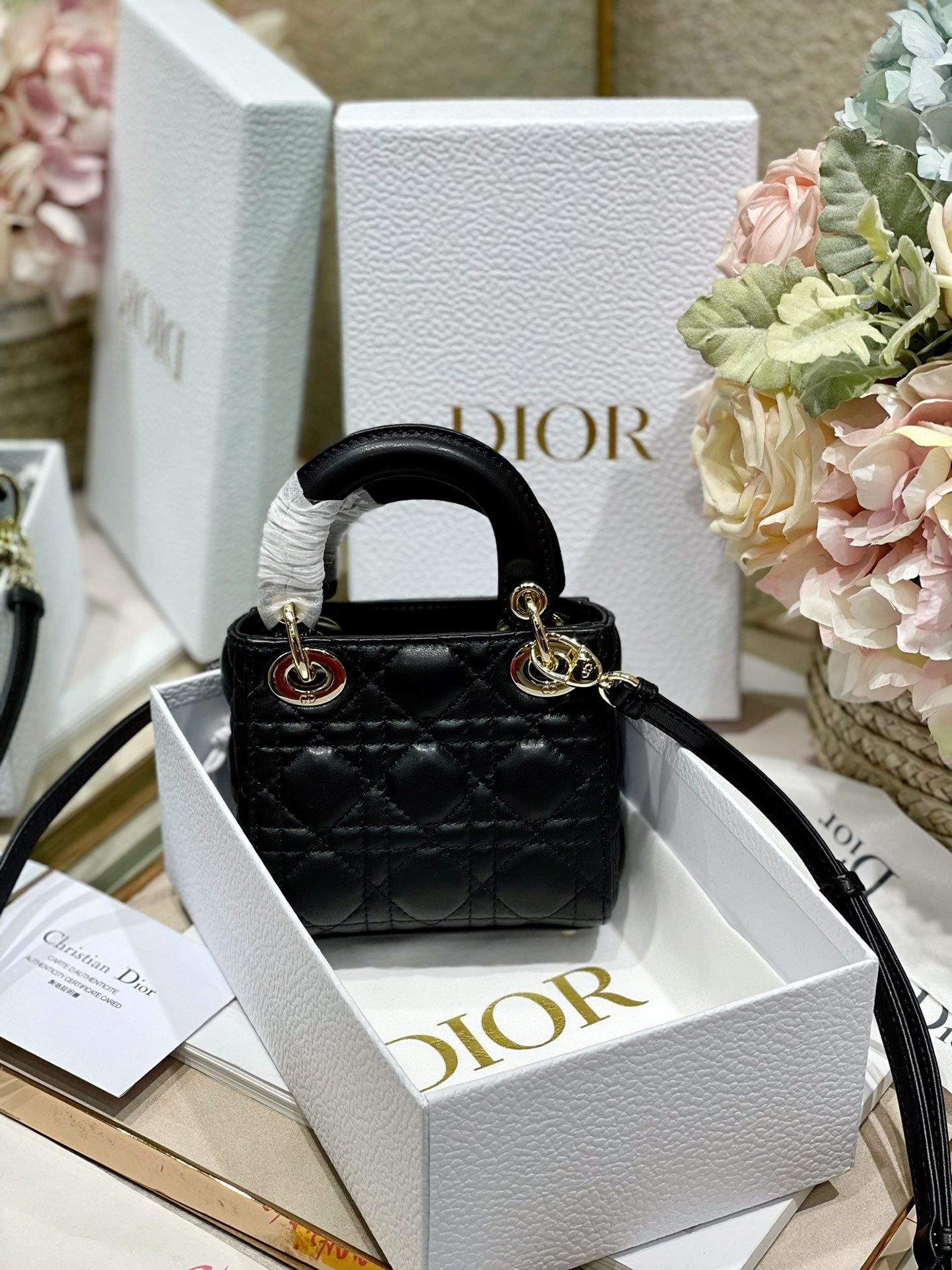 The Lady Dior bag epitomizes the House’s vision of elegance and beauty. Sleek and refined, the timeless creation is crafted in black lambskin and covered with Cannage stitching, creating an instantly recognizable quilted texture. Pale gold-finish metal D.I.O.R. charms embellish and illuminate its silhouette. Featuring a removable chain shoulder strap, the miniature Lady Dior bag can be carried by hand or worn crossbody as an ideal evening wear companion.