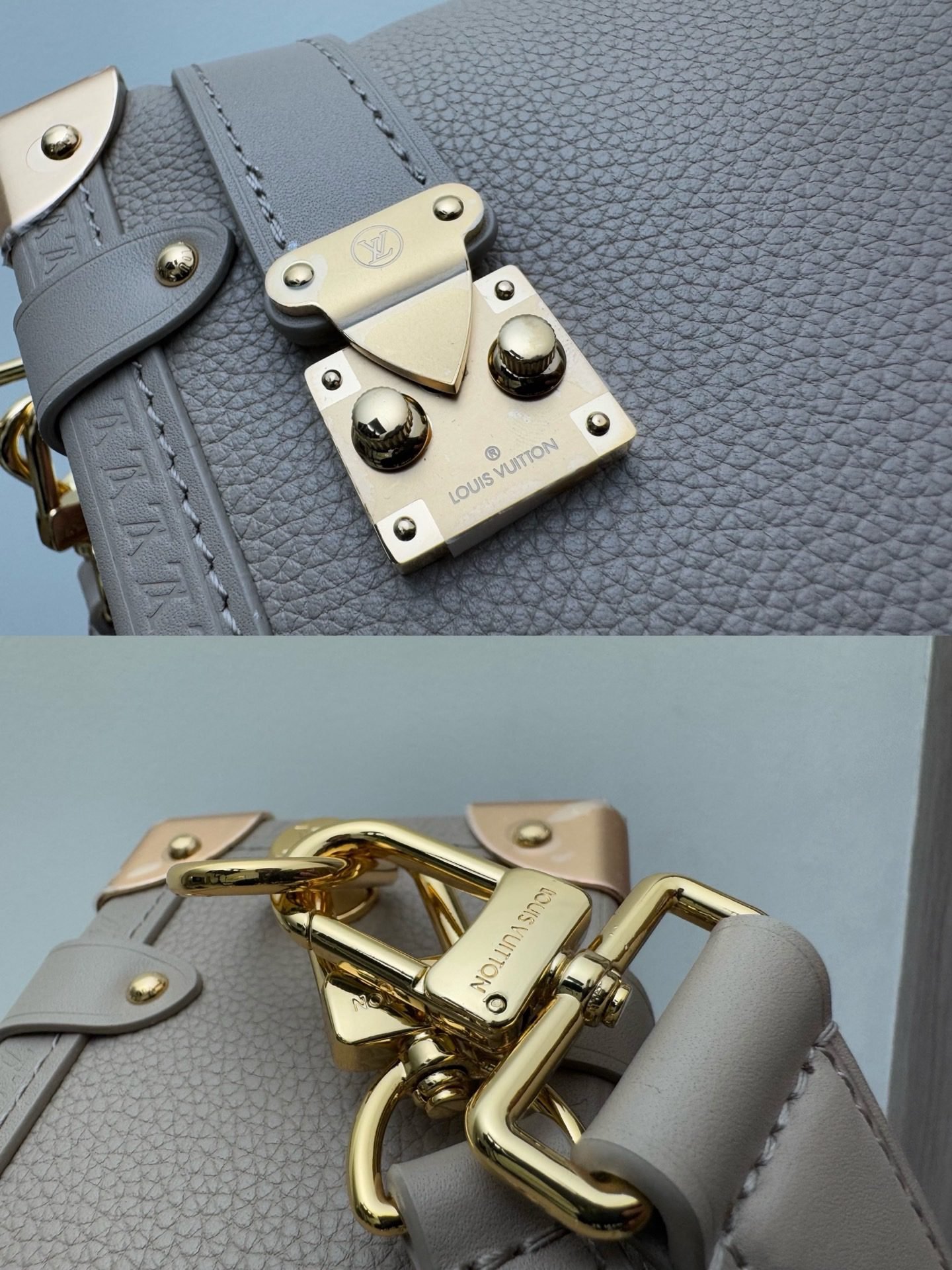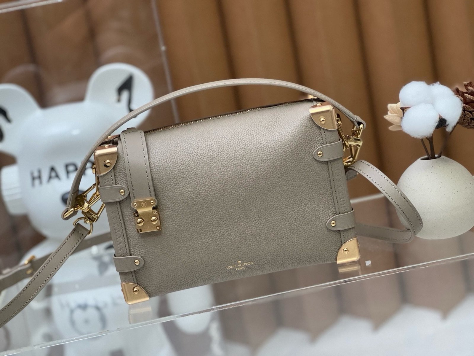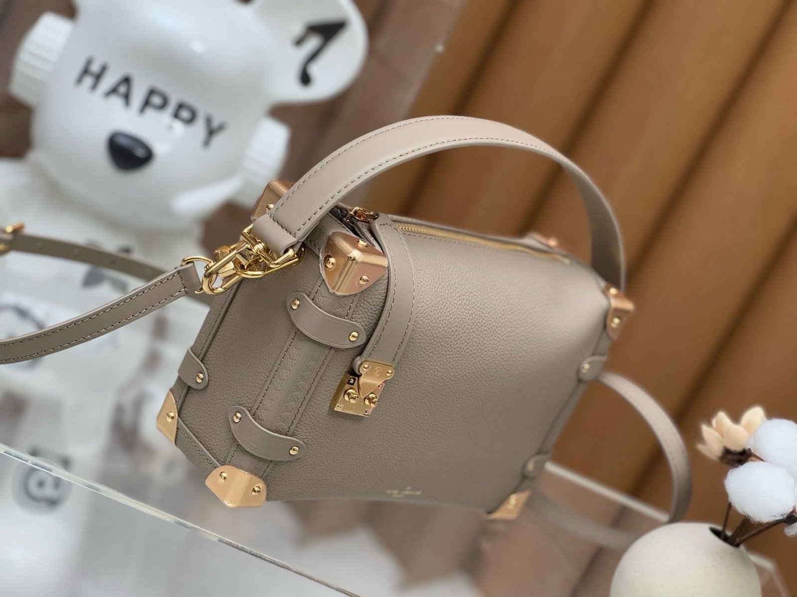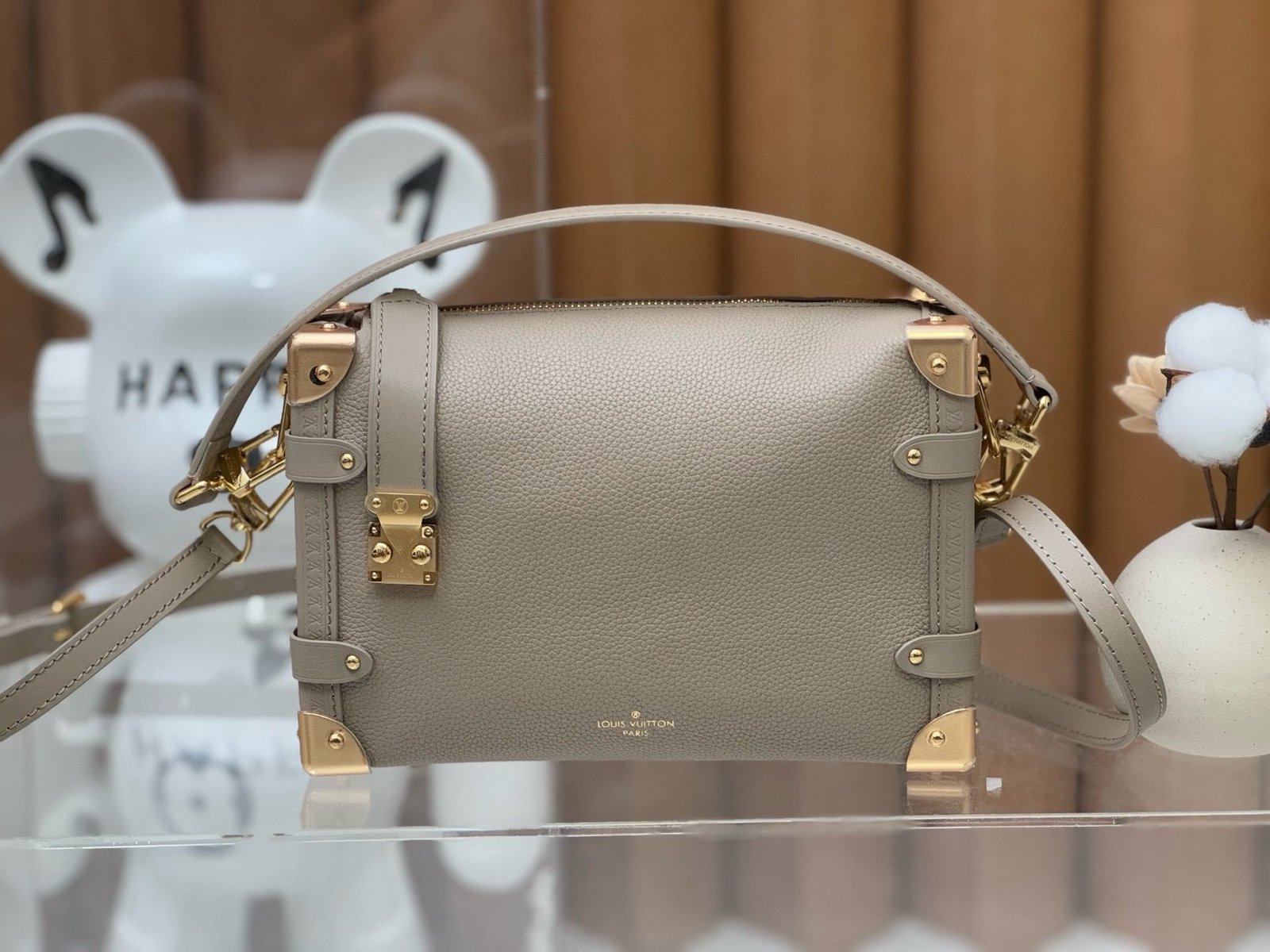 The elegant Side Trunk MM handbag is Creative Director Nicolas Ghesquière’s ode to the House’s historic trunks. Made from grained calf leather with smooth cowhide-leather trim, it features an S-lock and reinforced metallic corners. The removable handle enables hand carry while the detachable and adjustable leather strap adjusts for shoulder and cross-body wear