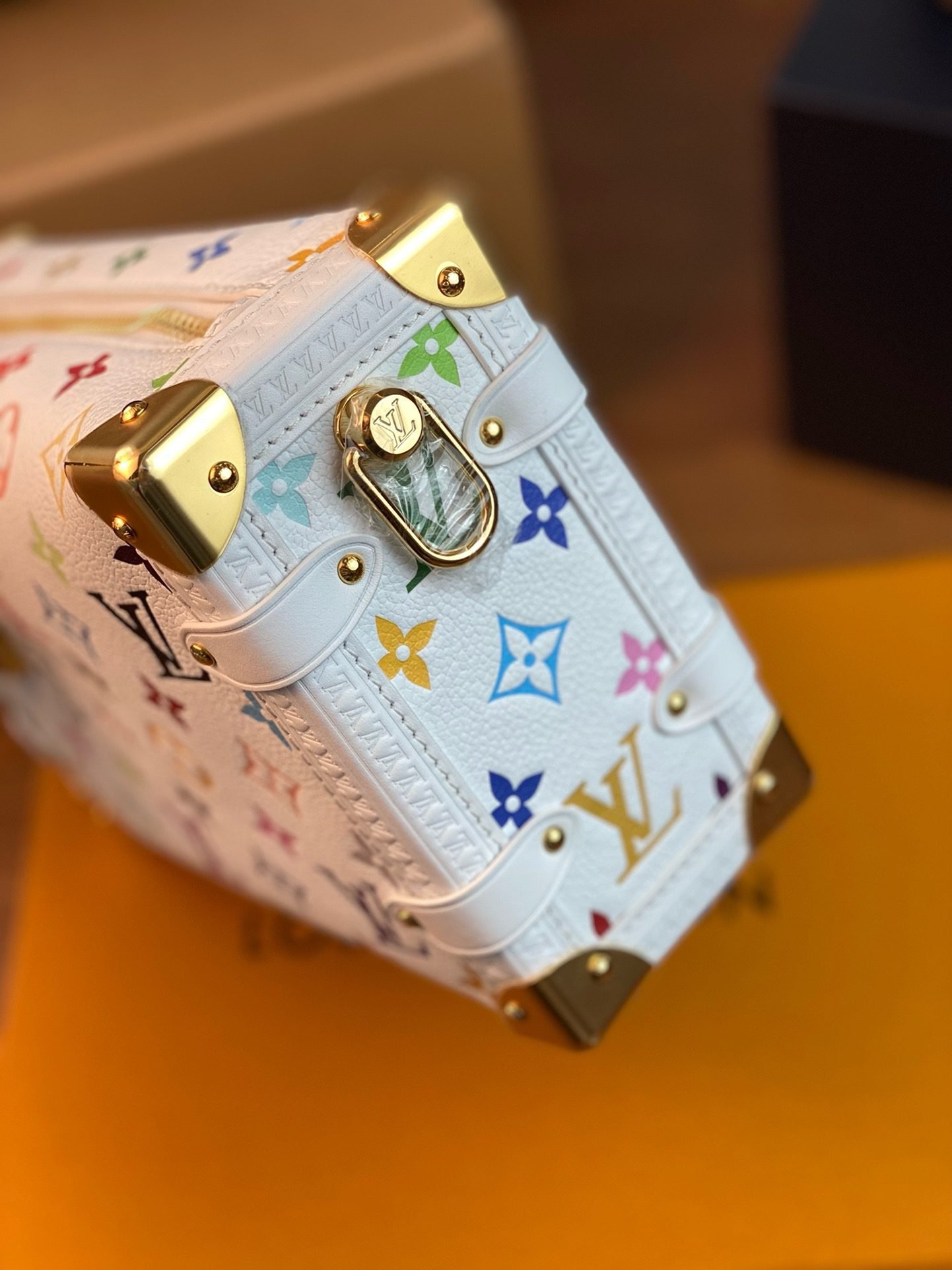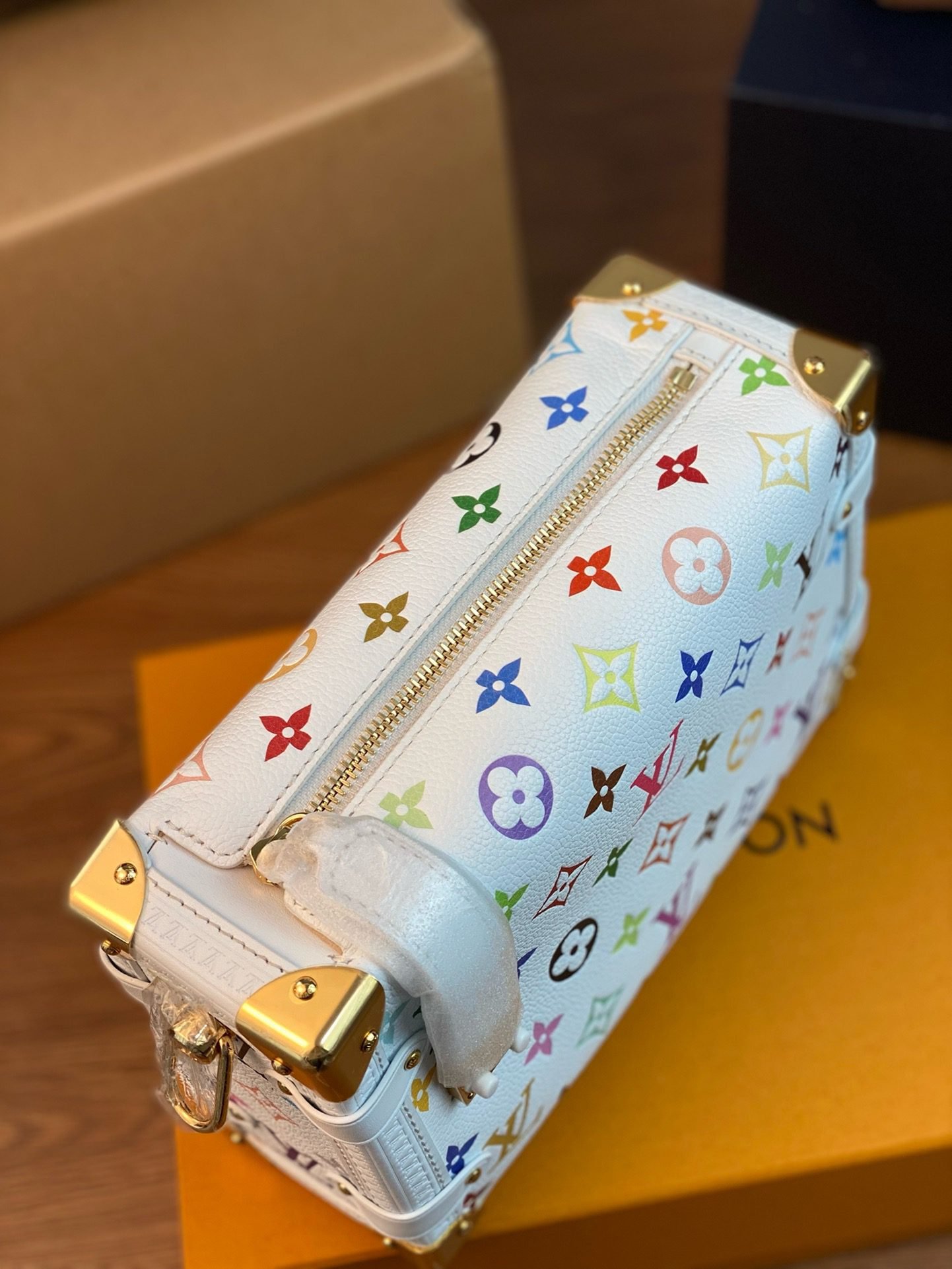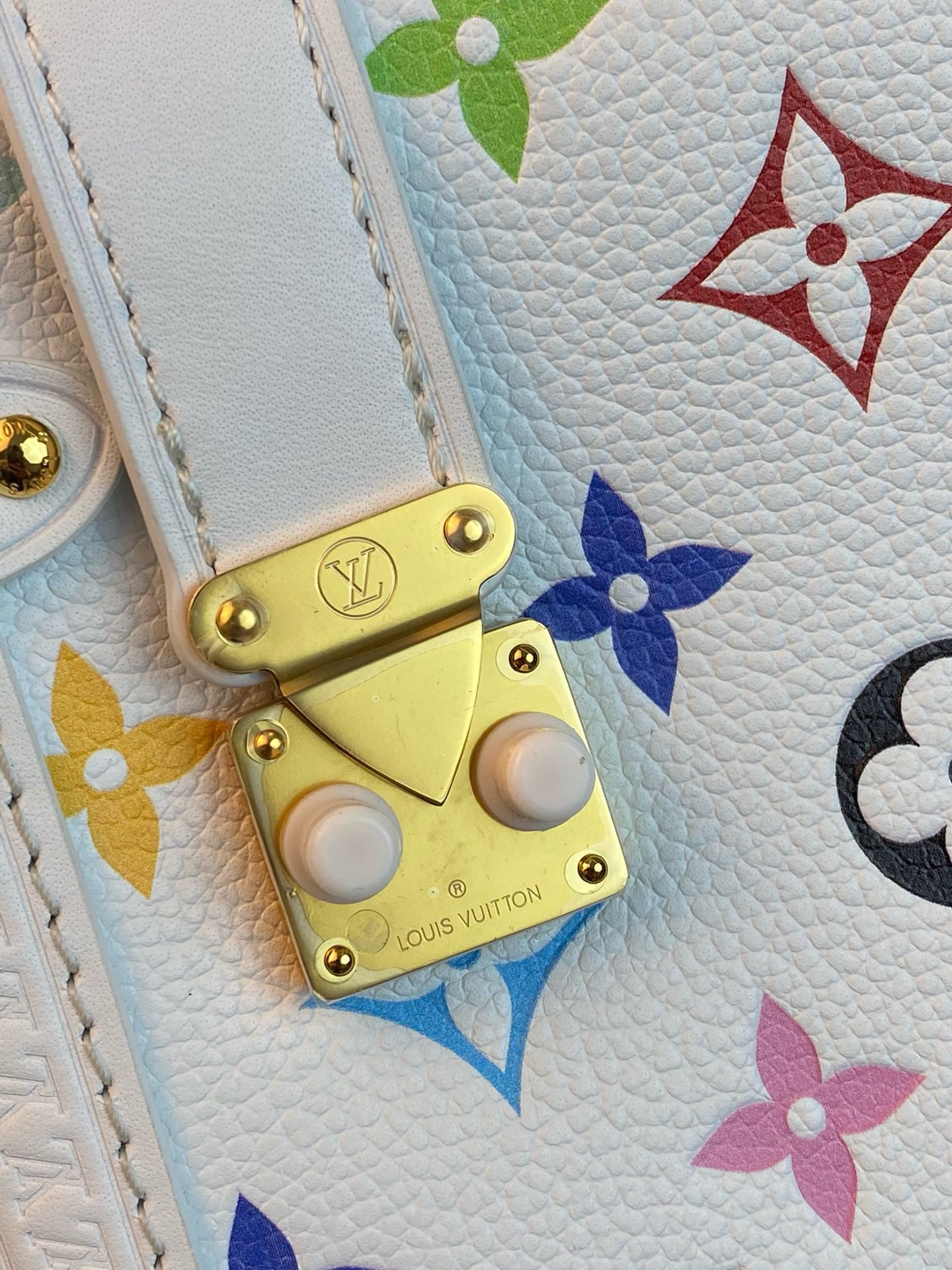 The iconic Side Trunk MM makes a spirited everyday statement in a playful version of the Monogram motif from the re-edition of the Louis Vuitton x Murakami collection. Crafted from supple cowhide, the rectangular silhouette pays homage to the House’s archival luggage complete with golden reinforced corners and an emblematic S-lock closure. The removable handle embellished with studs and strap offer versatile carry options, while the inside is large enough to stow daily essentials.