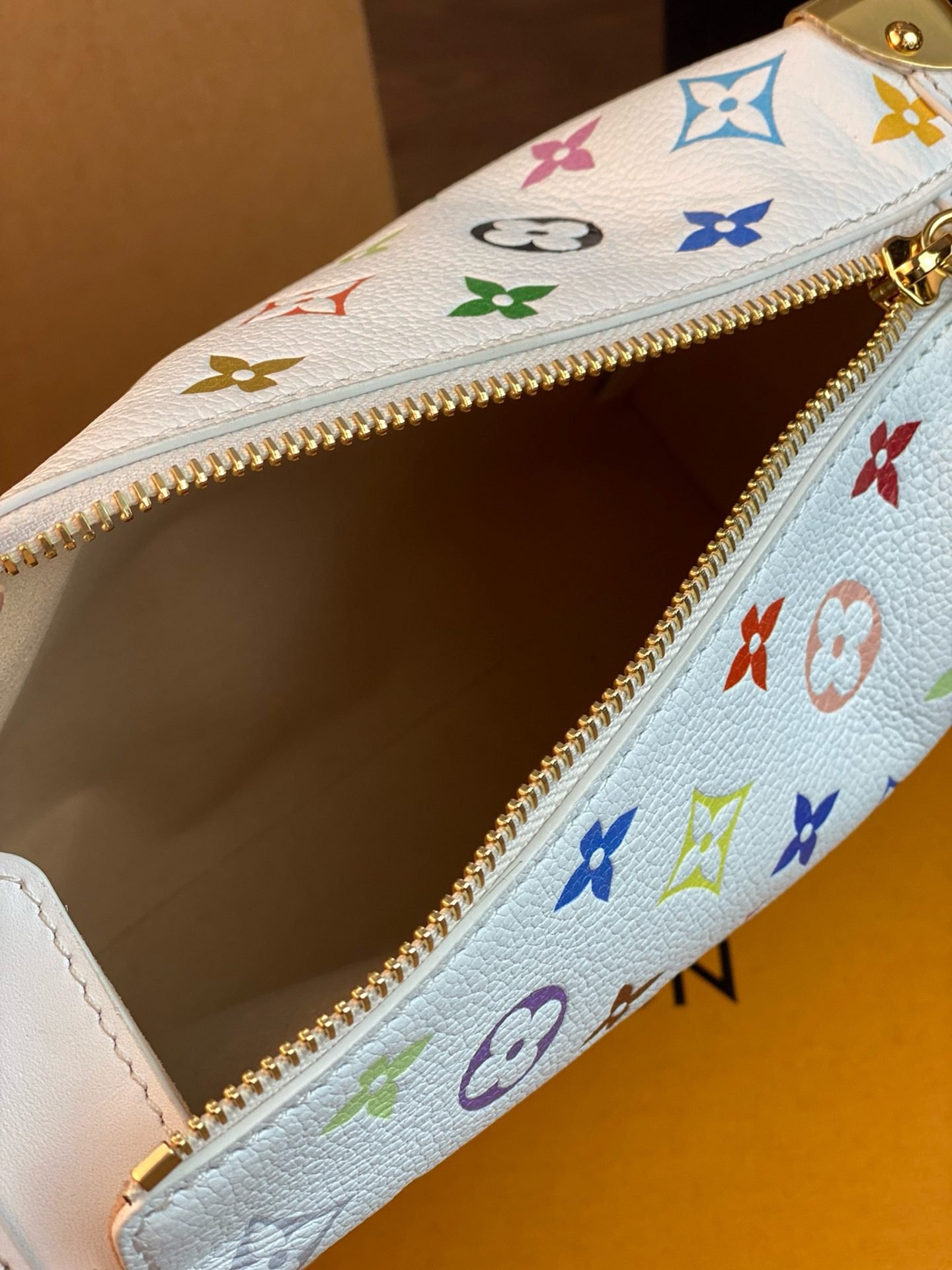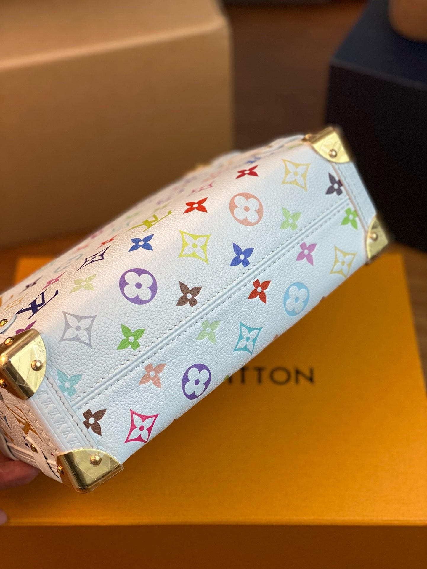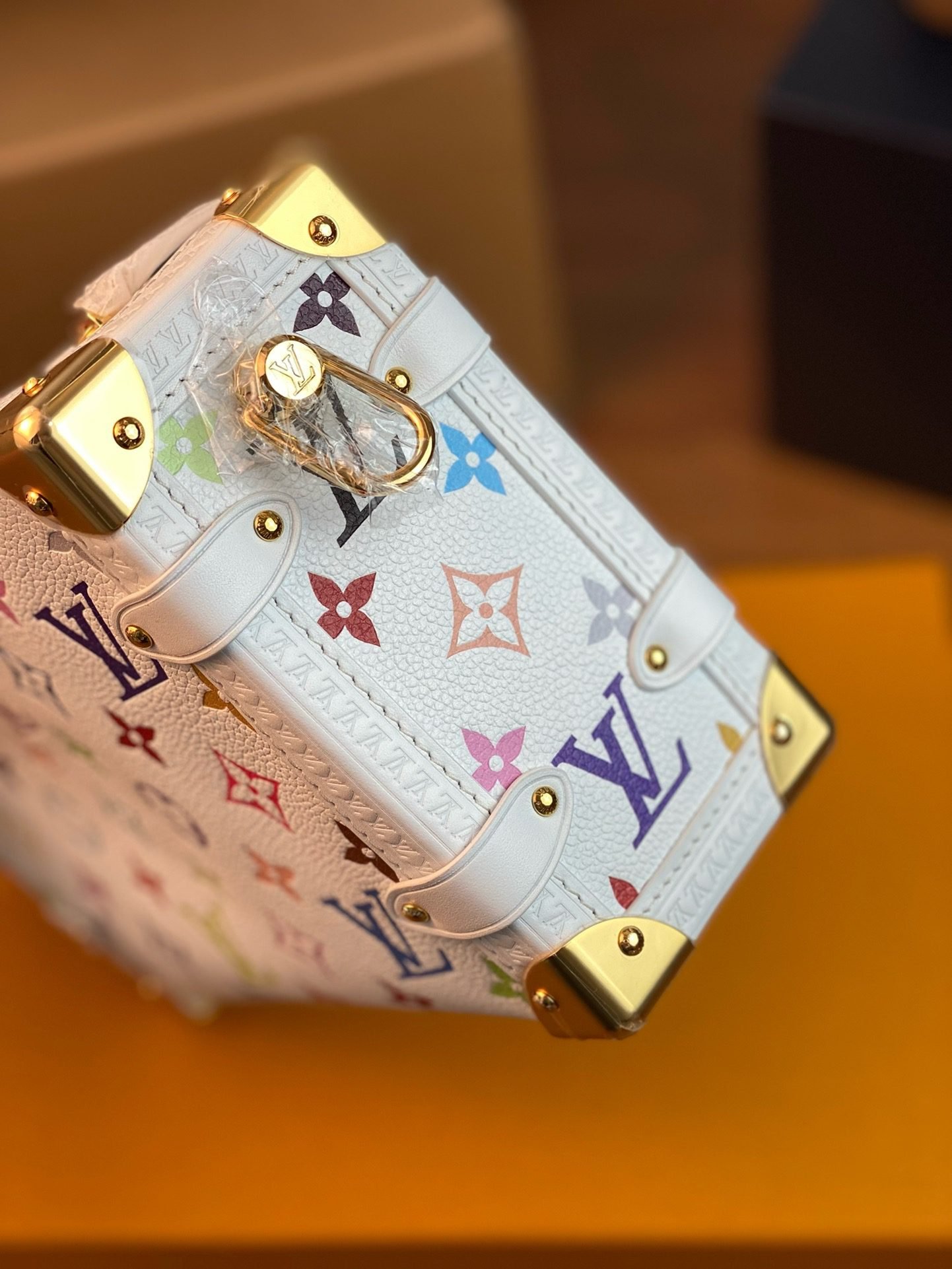 The iconic Side Trunk MM makes a spirited everyday statement in a playful version of the Monogram motif from the re-edition of the Louis Vuitton x Murakami collection. Crafted from supple cowhide, the rectangular silhouette pays homage to the House’s archival luggage complete with golden reinforced corners and an emblematic S-lock closure. The removable handle embellished with studs and strap offer versatile carry options, while the inside is large enough to stow daily essentials.