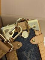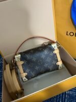 Evocative of the House’s historic trunks, the Side Trunk PM’s rectangular shape is fashioned from Monogram canvas with cowhide-leather trim and gold-color hardware. The reinforced corners and S-lock attached to the zipper are directly inspired by Louis Vuitton trunks. It can be carried by hand or on the shoulder thanks to the removable and adjustable leather strap.