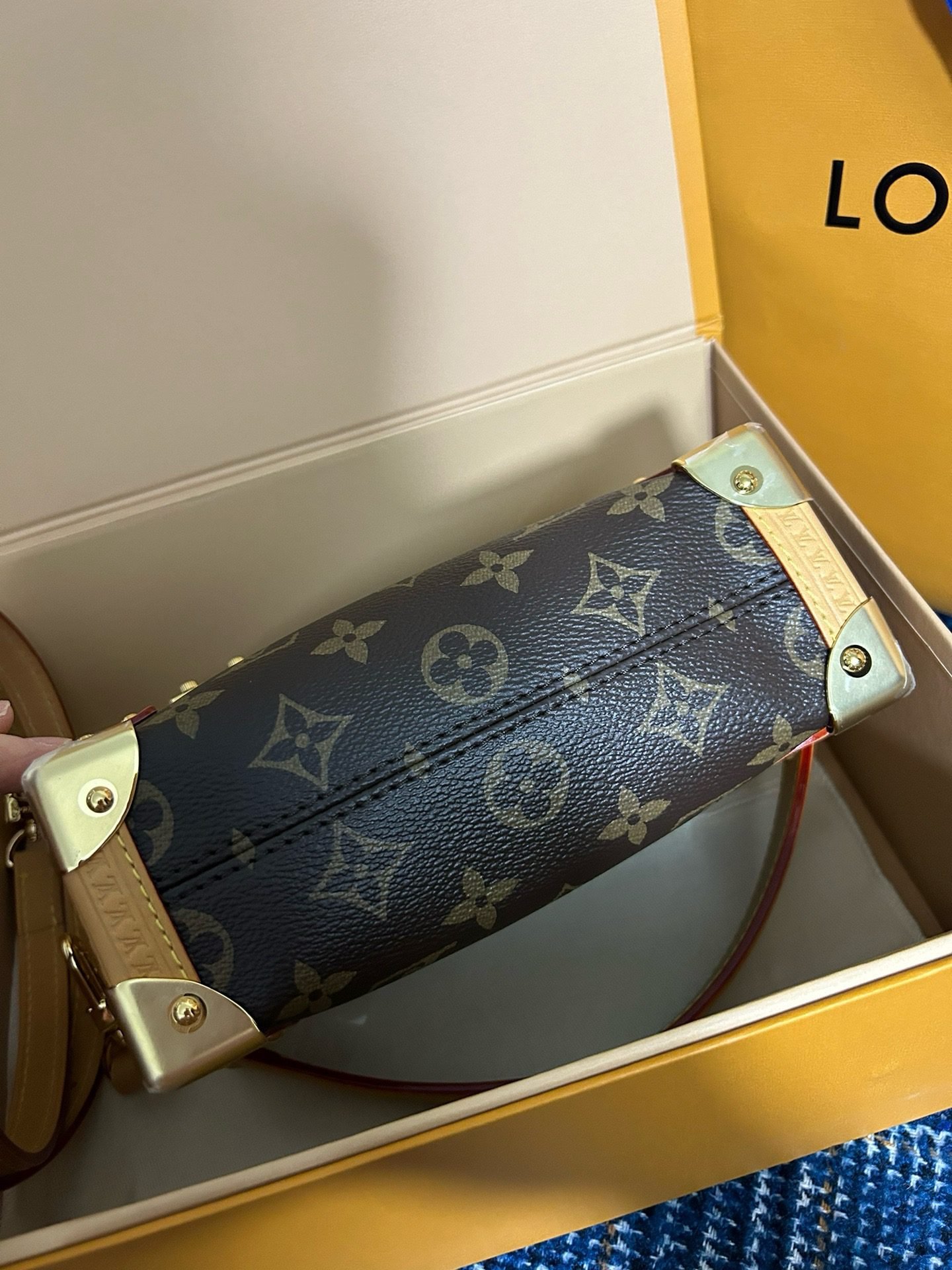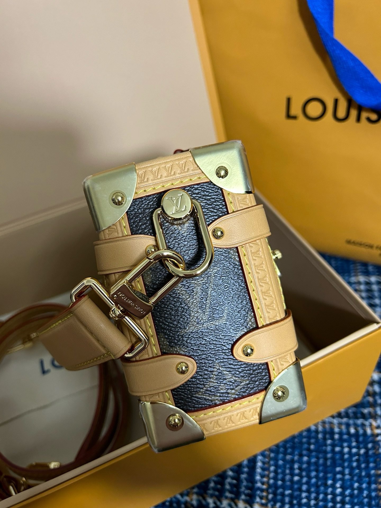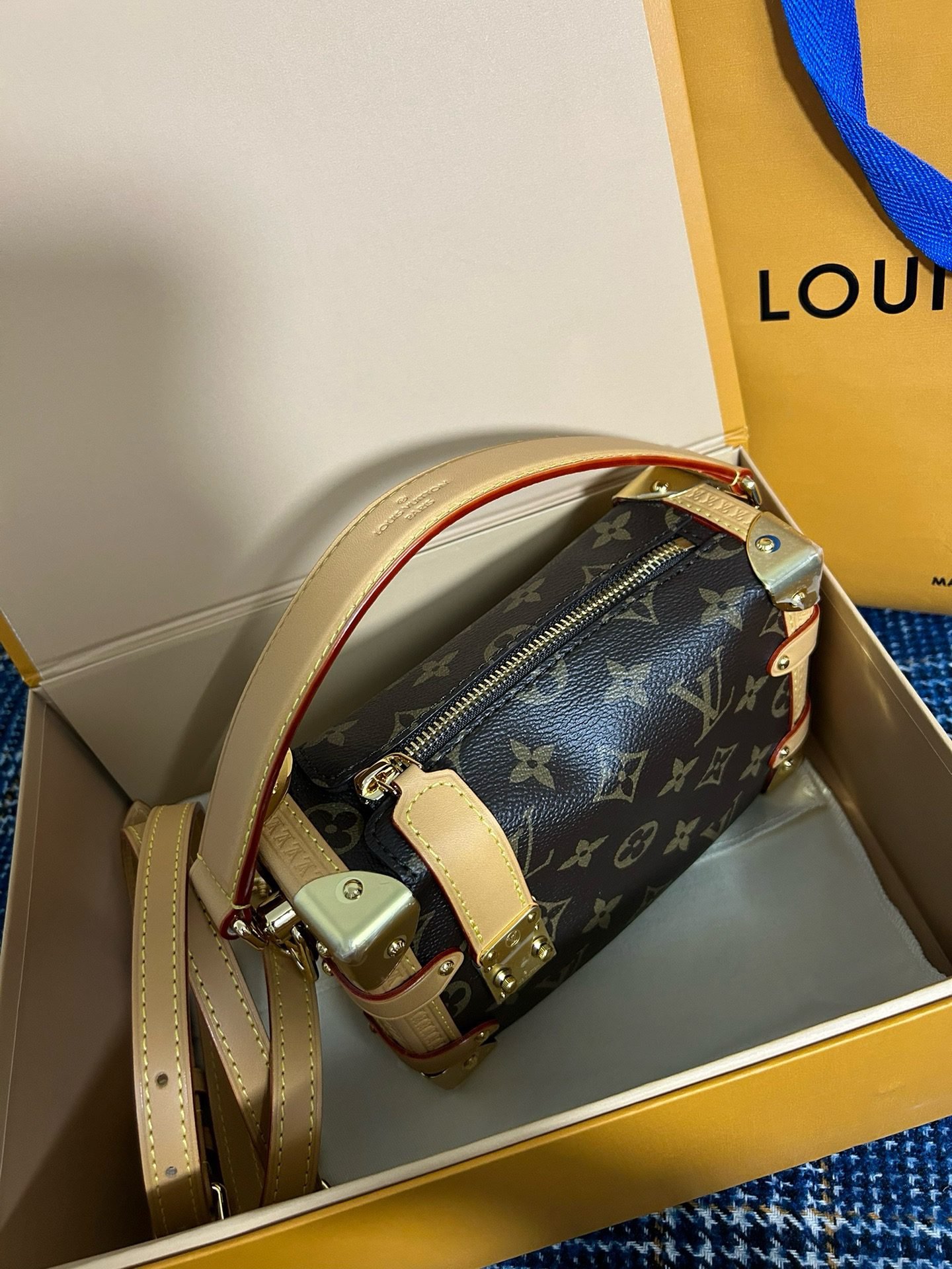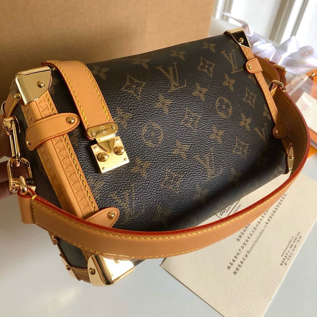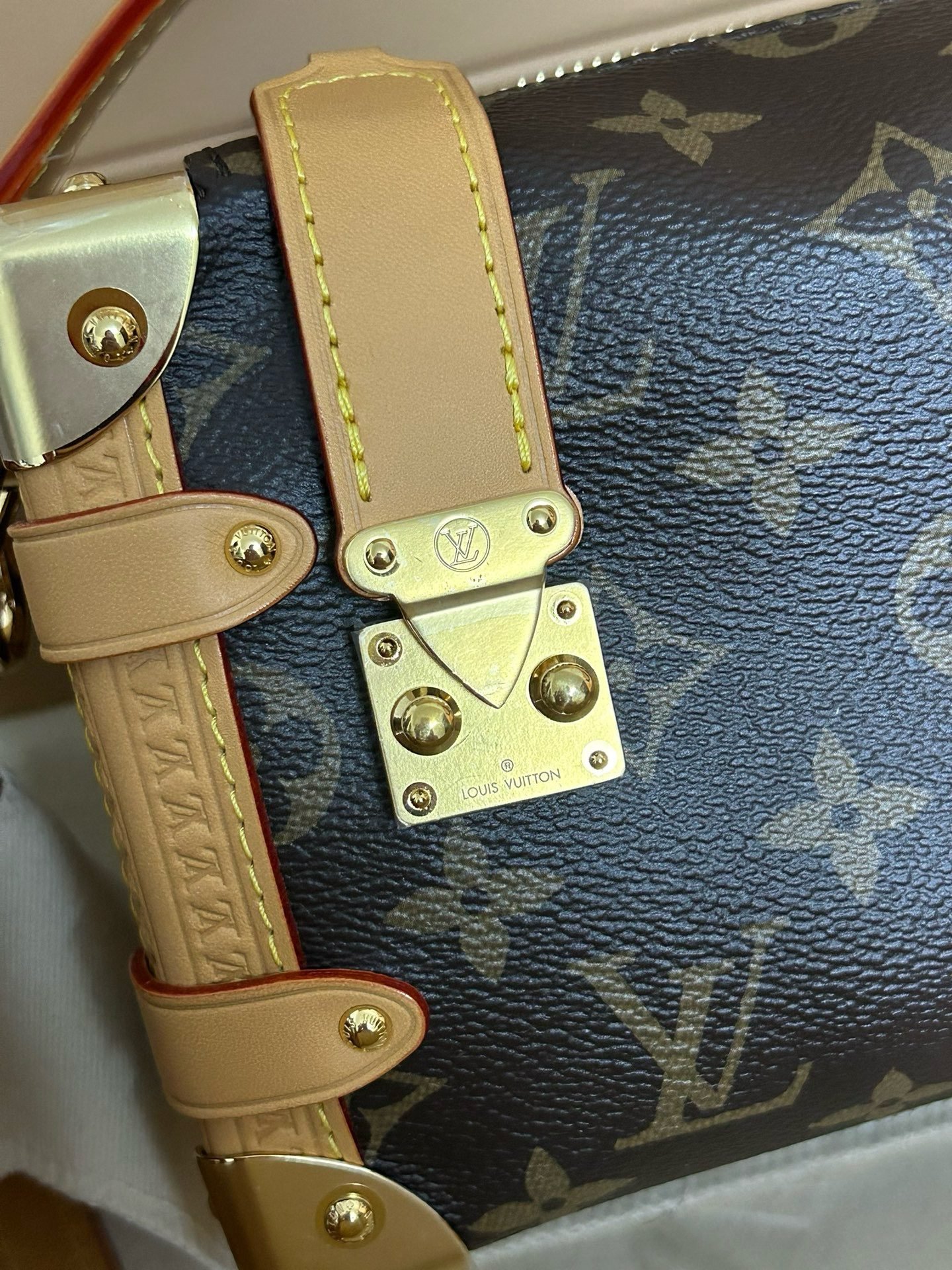 Evocative of the House’s historic trunks, the Side Trunk PM’s rectangular shape is fashioned from Monogram canvas with cowhide-leather trim and gold-color hardware. The reinforced corners and S-lock attached to the zipper are directly inspired by Louis Vuitton trunks. It can be carried by hand or on the shoulder thanks to the removable and adjustable leather strap.